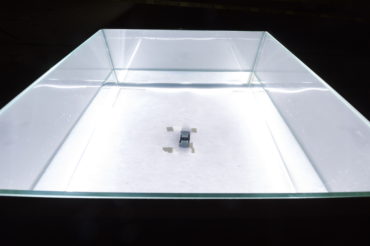 What shape does the water have? It is said that the water takes the shape of its container. With the sight you can access to this container form, but with other senses can perceive the internal composition of the liquid and its movements. Iceberg is an interactive sculpture that invites the public to perceive the shape of an object through touch and hearing, a liquid cube-shaped object. This work aims the subject of how we perceive with other senses and the shamanic rituals of initiation related to the expansion of perception.